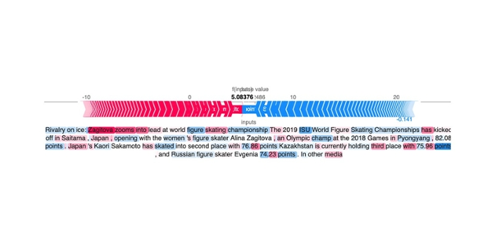 In the figure above, one of these problems is illustrated. The parts marked in red indicate that the statement is fake news, while the parts in blue indicate that it is not the case. In the skating example, the explanation method of why the algorithm labelled them this way is inconsistent as it assigns opposite weights to the same words. For example “skating” is highlighted in both red and blue in the same text.